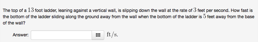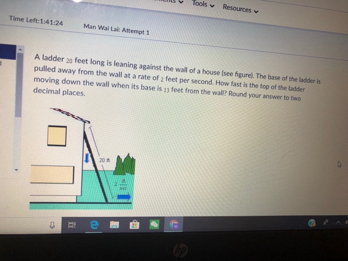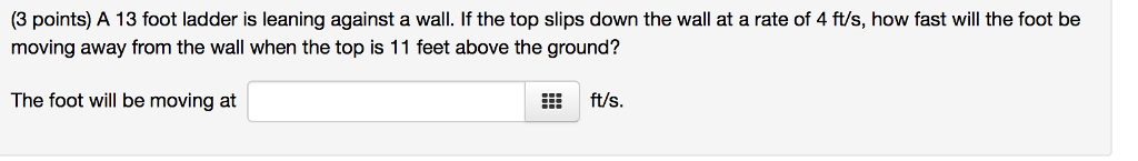 A 13 Foot Ladder Is Leaning Against A Brick Wall. The foot of the ladder is pulled along the ground away from the wall, at the rate of 1.5 m/s. Transcribed image text from this question.