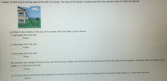 Calculate the distance the ladder reaches up the wall. Denoting time in seconds by t, it is further noted that. Round your answers to three decimal places.) (a) how fast is the top of the ladder moving down the wall when the base is given below?