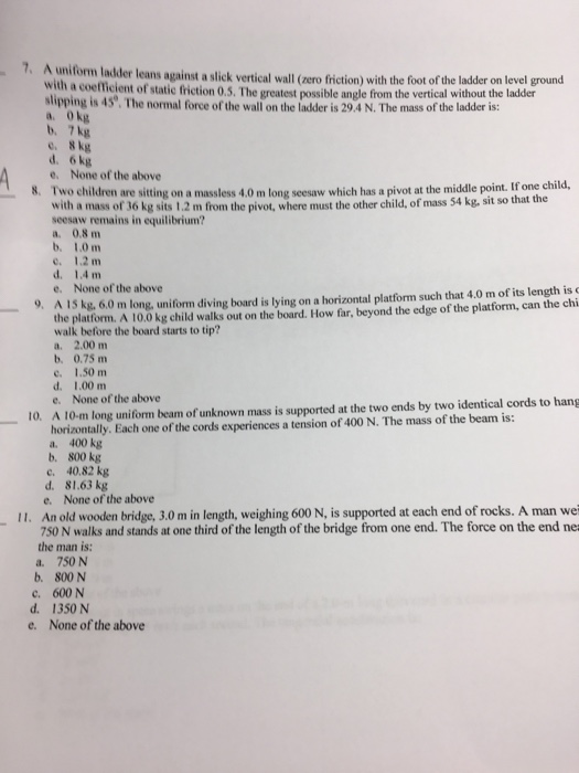 A uniform ladder is 10 m long and weighs 270 N. In the ... from www.webassign.net