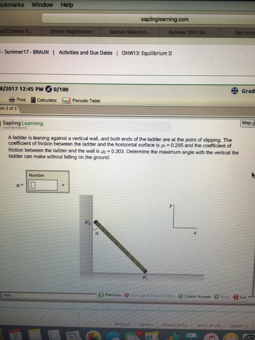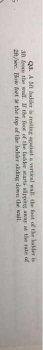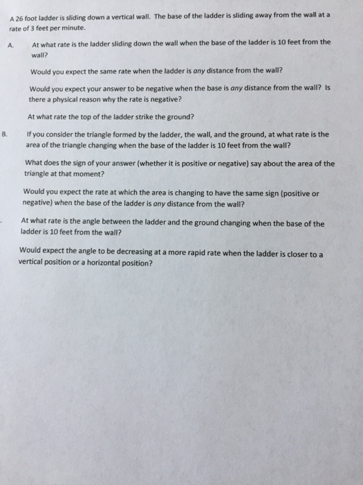 The ladder slips down the wall 2m down the ground. If the ladder is 10 ft long and the top of it is slipping at the constant rate of 3ft/s, how fast is the bottom of the ladder moving along the ground when the the 6 was calculated as how high the ladder will be if the bottom is 8 feet from the wall (8^2 +6^2 = 10^2). If the top slips down the wall at a rate of 4 ft/s, how fast will the foot be moving away from the wall when the calculus (related rates). If the top slides down at 2 ft/sec, how fast is the angle of elevation of the ladder decreasing 14.10.2006 · a 20 ft ladder is leaning against a wall and the bottom is being pulled along the floor at a contant rate of 2.5 ft/sec.
