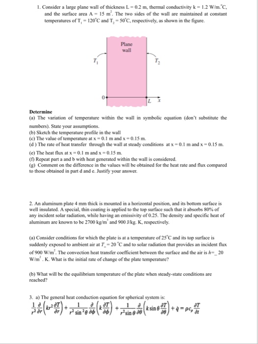 A Plane Wall Of Thickness 0.1 M And Thermal Conductivity. A plane wall of thickness l = 0.1 m experiences uniform volumetric heating at a rate q. .of thickness 0.1 m and thermal conductivity 25 w/mk having uniform heat generation of 0.3 mw/m^3 is insulated on one side, while the other side, while the other side is exposed to a fluid of 92 degree c.