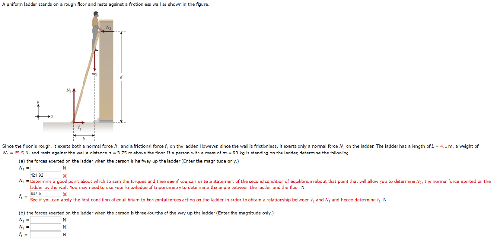 Weight of the ladder = 276 n and makes an angle of 54.51° with the floor. The ladder weighs 160 n. (a) find the horizontal and vertical forces the ground exerts on the base of the ladder when a firefighter of mass m2 is a distance x from the.