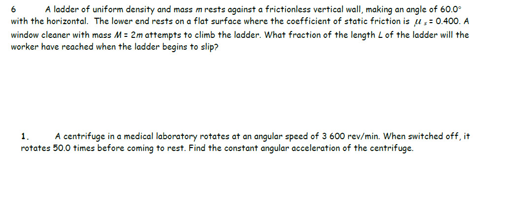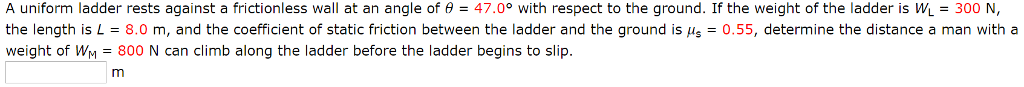 A Uniform Ladder Rests Against A Frictionless Vertical Wall. The coefficient of static friction between the foot of the ladder and the ground is 0.40. .ladder 5.0 m long rests against a frictionless, vertical wall with its lower end 3.0 m from the wall.