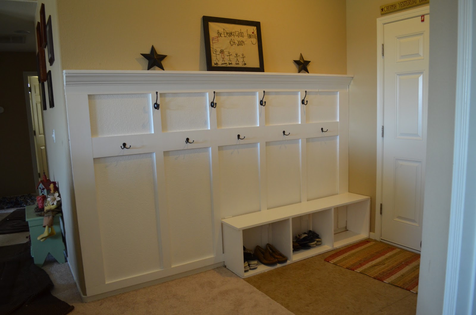 I have ripped out the baseboards, scrubbed the floor to see if it could be saved, painted the top section of the wall, and built a decorative frame for.